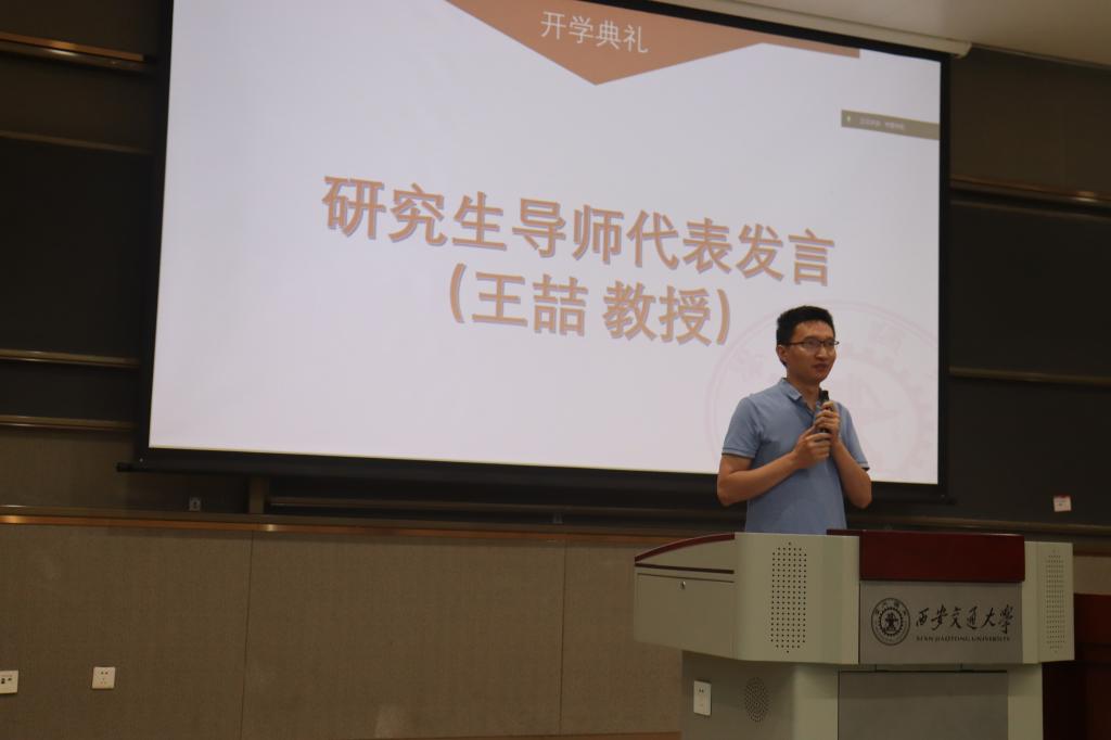 研究生导师代表王喆通过轻松的聊天方式,向大家分享了自己在求学阶段的艰苦历程。王老师从自身经历出发鼓励同学们保持乐观心态,不要害怕压力和挫折,将挑战视作乐趣。希望同学们能够做到‘心中有爱,眼中有光’,懂得关爱他人,懂得感恩,能够与人为善,对生活的热爱和对未来的憧憬,对挑战充满勇气。