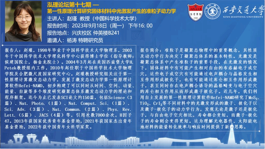 【泓理论坛】第十七期 ——第一性原理计算研究固体材料中光激发产生的准粒子动力学