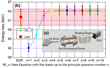 图1、(a)实验装置示意图,(b)实验测量的能损值(EXP.)与考虑不同原子态(包括基态n=1与不同激发态n=2-10)以及所有重要原子过程的理论计算能损值(RE_n)的对比