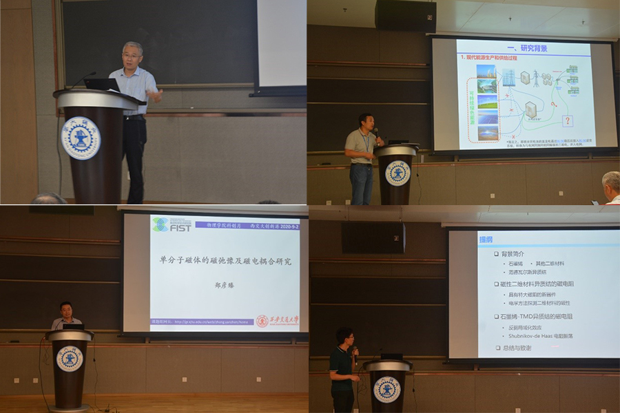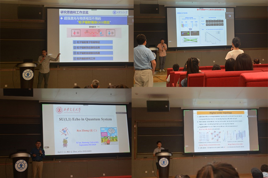 9月2日,物理学院栗建兴、雷铭、张仁、朱晓宇、杨森、杨生春、郑彦臻、王喆和王文慧等老师围绕《强激光驱动的QED效应及其应用》、《基于空间光场调控的光学微操纵技术》、《SU(1,1)Echoin Quantum System》、《高阶拓扑超导体》、《铁电/铁磁材料的奇异结构(构型)与性能》、《光电解水催化材料结构设计及性能研究》、《单分子磁体的磁弛豫及磁电耦合研究》、《二维材料的电学输运特性》和《表面等离激元的传输特性及能量损耗研究》等研究方向的前沿科学问题,带来8场学术报告,深入浅出的介绍了课题的研究意义、研究内容、研究结果以及未来的应用。在场师生认真聆听,在交流互动环节,踊跃发言提问,气氛轻松热烈,让广大师生感受到了学术的魅力。