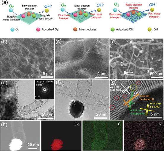 针对以上问题,西安交通大学理学院丁书江教授、肖春辉副教授课题组通过界面调控和结构设计制备了类水母状的Mott-Schottky催化剂,该催化剂可以促进ORR过程中的电子转移和质量传递。由于Mott-Schottky效应,电子在FeN掺杂的石墨化碳(NG)界面上重新分布,提高了催化位点的活性,有效促进电荷转移。半封闭的空腔结构和触手状的碳纳米管(CNTs)增强了活性物质和活性位点的碰撞,分层级的多孔结构提高了ORR过程中的质量传递。该工作加深了对ORR过程中电子转移和质量传递重要性的理解,并为构建高效的Mott-Schottky催化剂构建了新的途径。