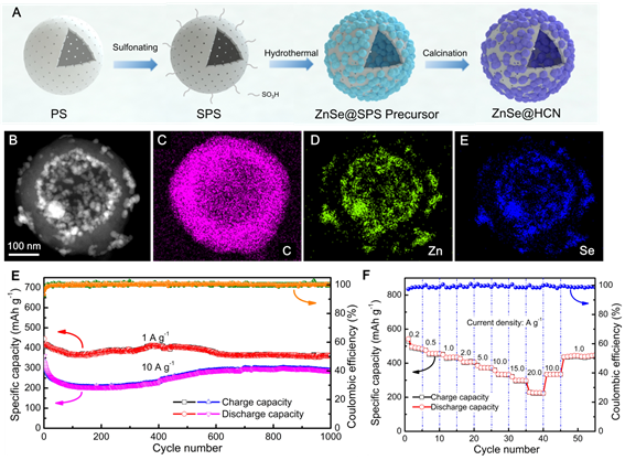 近日,西安交通大学丁书江教授、高国新副教授团队和剑桥大学郗凯博士在国际能源重要期刊Nano Energy(影响因子13.120)上发表了题为 “Construction of ultrafine ZnSe nanoparticles on/in amorphous carbon hollow nanospheres with high-power-density sodium storage”的论文,第一作者为理学院芦世瑶硕士生,通讯作者为高国新老师和郗凯博士,西安交大为论文第一通讯单位。该工作借助乙二胺对离子在介孔通道的辅助渗透作用将超细ZnSe纳米颗粒均匀生长在无定型空心碳纳米球的壳层内表面和外表面(ZnSe@HCNs),从而提升了电极材料的导电性和结构稳定性,增大了电活性ZnSe颗粒在表面和近表面的氧化还原反应能力,提高了比容量、长循环稳定性和高倍率性能,在1 A g-110 A g-1的电流密度下循环1000圈后,其可逆比容量分别为361.9285.9 mAh g-1。进一步与磷酸钒钠正极组装成全电池后发现全电池的放电比容量达到313.1 mAh g-1。该研究成果为制备高性能电极材料提供了一种新策略。