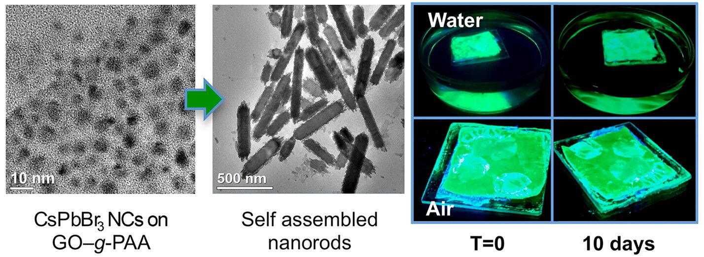 该研究成果已于近期在线发表于期刊Nano Letters (影响因子12.712)上,题为“Nanorod Suprastructures from a Ternary Graphene Oxide-Polymer-CsPbX3Perovskite Nanocrystal Composite That Display High Environmental Stability”。该研究工作是课题组继2016年ACS Nano(2016, 10, 7943)和2017年Nanoscale(2017, 9, 17688)文章以来的又一重大进展。论文第一作者为课题组青年教师潘爱钊博士(交大为第一作者单位与通讯作者单位)。