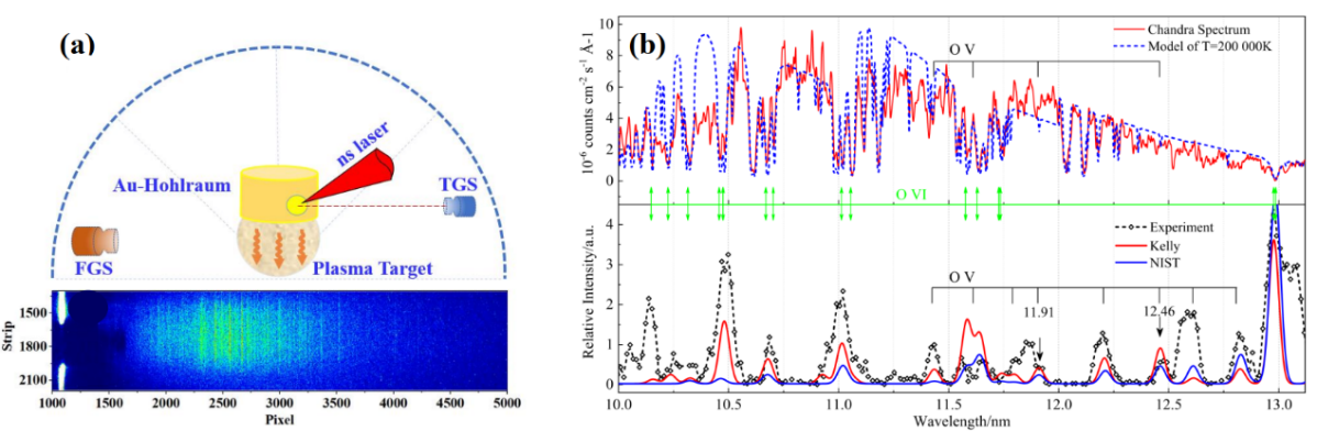 图2. (a) 实验室制备类白矮星H1504+65大气状态物质的实验设计以及诊断排布示意图;(b) 实验室观测光谱钱德拉天文观测数据的对比