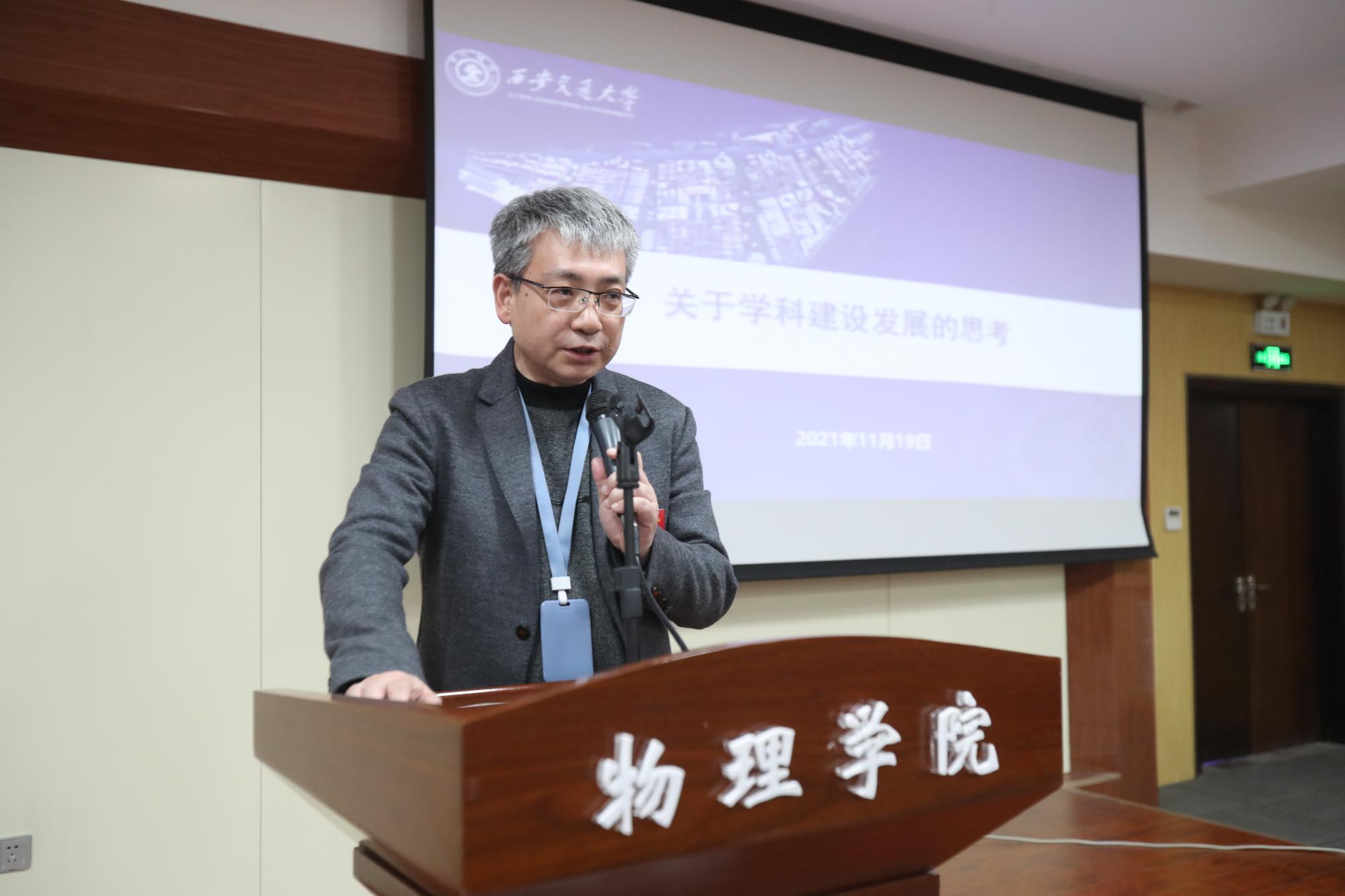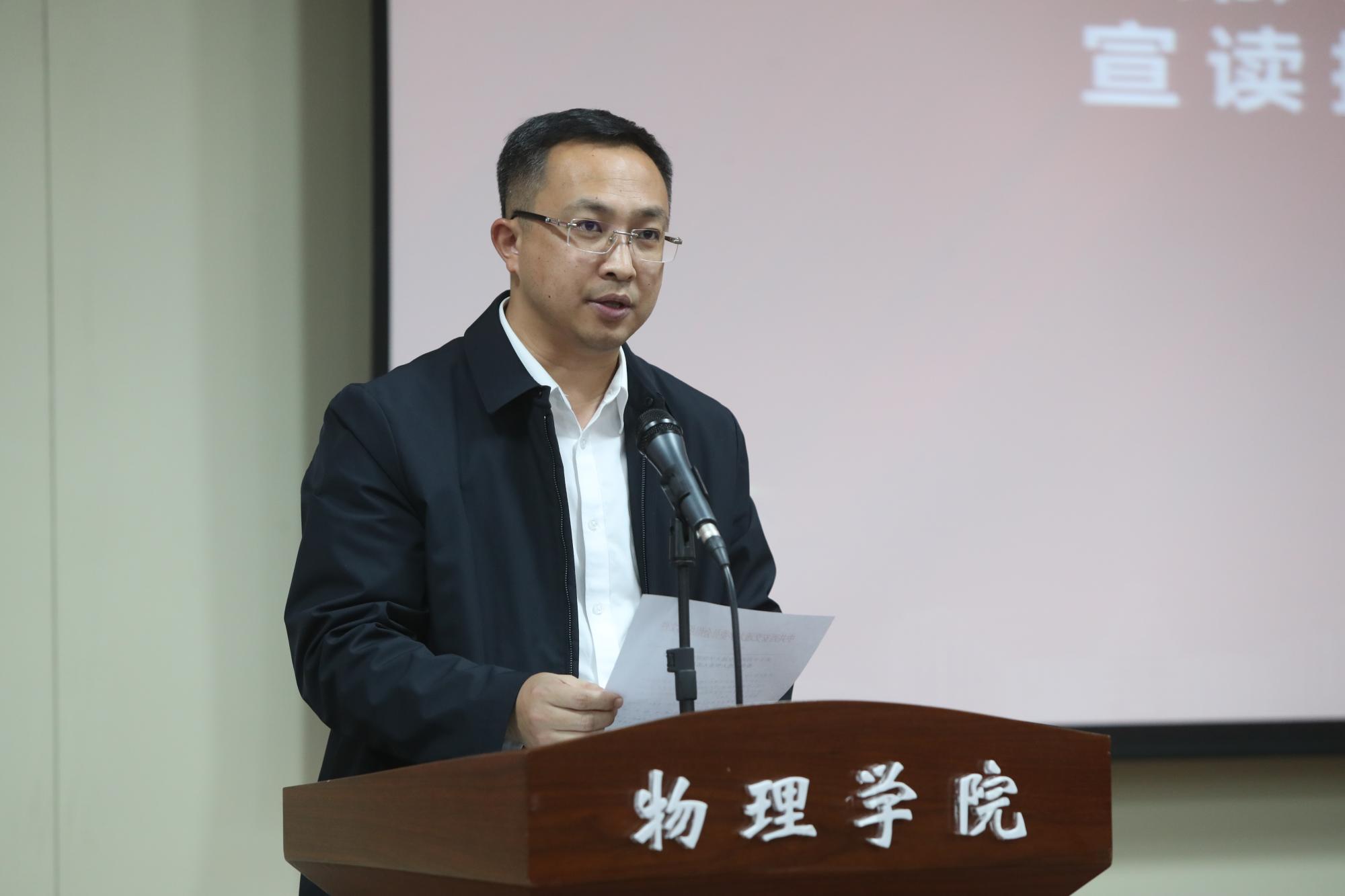 赵昌昌指出,物理学院成立后,在校党委的领导下,围绕中心工作,班子齐心协力、密切配合,在各项工作方面保持了良好发展势头,取得了长足进展,学校党委对物理学院工作表示肯定。而当前物理学院在加快建设科技强国进程中承担重大基础研究和科技攻关领域还存在差距。对此,他对领导班子提出了四点希望:一是要不断加强政治建设;二是要始终坚持立德树人根本任务;三是要心怀“国之大者”,推进科学研究取得新突破;四是加快推进一流学科建设和创新港建设。