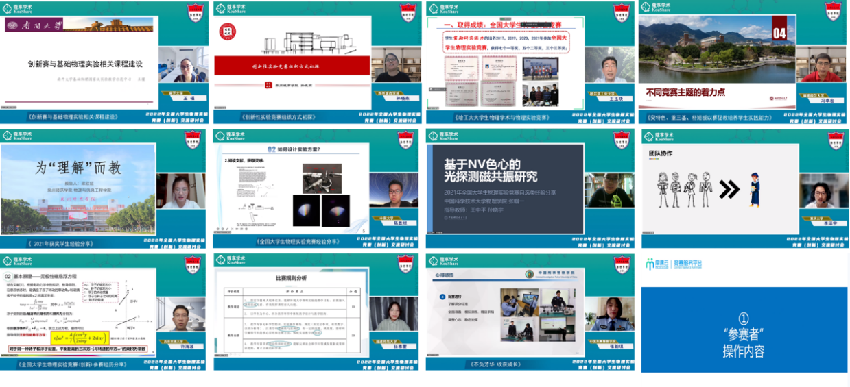 下午的会议由重庆大学韩忠教授和中南大学徐福新教授主持,会议邀请了部分往届竞赛优秀组织单位代表和一等奖获奖学生代表分享经验。南开大学王槿教授、福建师范大学冯卓宏教授、哈尔滨工业大学王玉晓教授和苏州城市学院孙晓燕教授热情地和大家交流在实验竞赛上作出的努力以及改进,分享各自学校的优秀做法。来自泉州师范学院梁欣延、中南大学陈胜坦、福建师范大学任雅萱、中国科学技术大学张帼一、中国刑事警察学院张韵琪、西安交通大学许海波和重庆大学李泽宇等学生积极和大家分享自己备战竞赛的过程,并给下届参赛的学生们提出了备赛的建议。最后,实验竞赛平台摩课云网站的工作人员对参赛者和领队如何利用好摩课云平台做了分享交流。