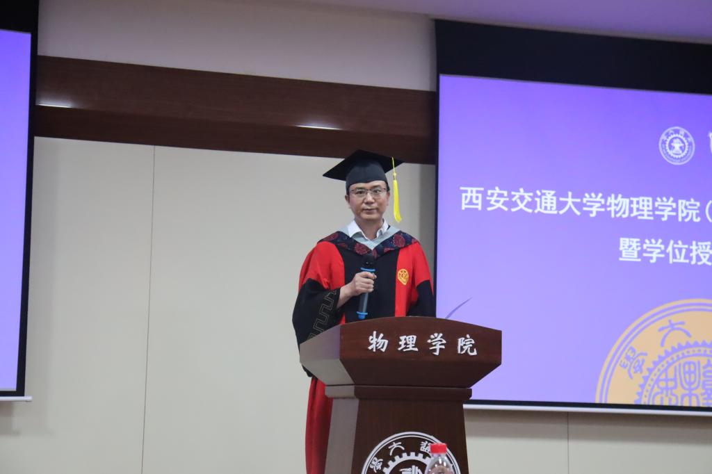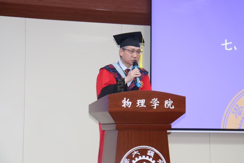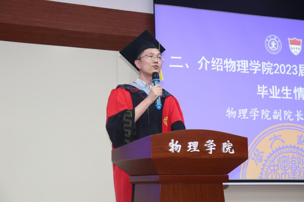 李蓬勃副院长介绍了物理学院2023届本科生、研究生毕业生就业情况,其中67.1%左右本科生继续深造攻读研究生,他鼓励同学们要砥砺前行、勇敢拼搏,争做新时代有为青年。约有45.3%研究生毕业生选择在西部地区建功立业,他希望每一位学子都如点点星光,照亮中国、照亮世界,为世界之光。