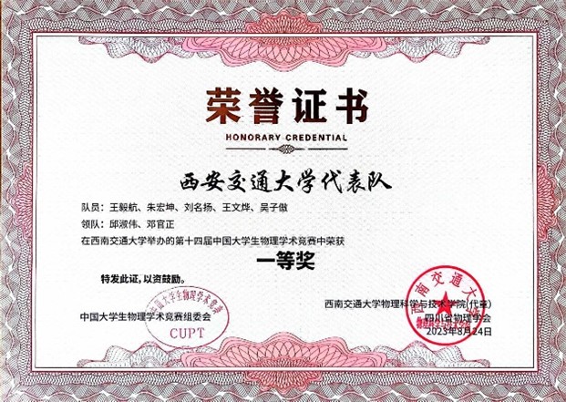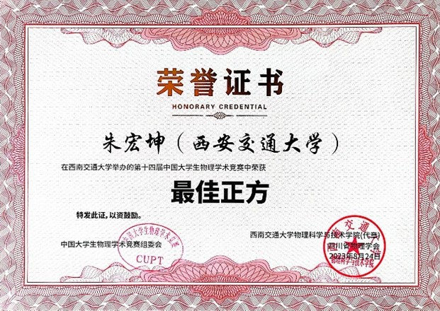 8月20日至8月25日,第十四届中国大学生物理学术竞赛(China Undergraduate Physics Tournament,简称CUPT)由西南交通大学的组织下举行,来自全国各地63所高校的64支代表队的学子们开展了精彩的交流与竞争。经过4天5轮的高强度的激烈角逐,西安交通大学代表队获大赛全国一等奖,再创佳绩。同时,队员朱宏坤同学获得了最佳正方奖。