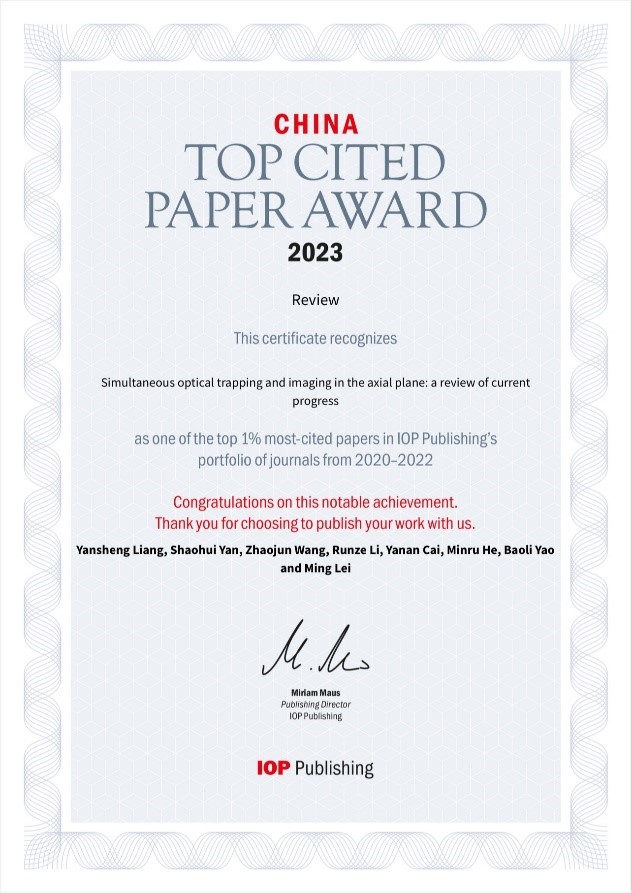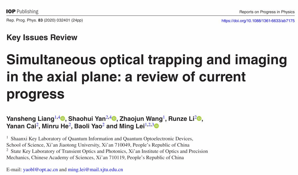 近期,英国物理学会出版社(IOP Publishing)公布2023年“中国高被引文章奖”获奖名单,以表彰中国研究人员在全球科学界的影响力以及他们对物理学的宝贵贡献。西安交大物理学院雷铭教授团队在Reports on Progress in Physics(IF=18.1)的综述论文“轴平面同时光学捕获与成像”(Simultaneous optical trapping and imaging in the axial plane: a review of current progress)获得IOP Publishing的前1%高被引荣誉。西安交通大学物理学院为论文第一通讯单位,第一作者是西安交通大学物理学院梁言生副教授,共同第一作者是中国科学院西安光学精密机械研究所的严绍辉研究员,通讯作者是西安交大物理学院的雷铭教授(lead contact)和中国科学院西安光学精密机械研究所的姚保利研究员。