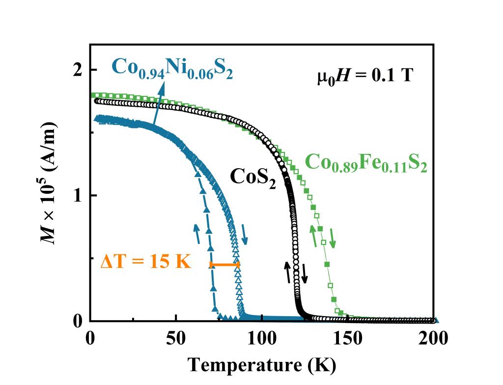 图2.空穴和电子掺杂后CoS2单晶的磁化强度温度依赖性。其中,电子掺杂样品Co0.94Ni0.06S2表现出明显的热滞现象。