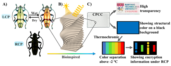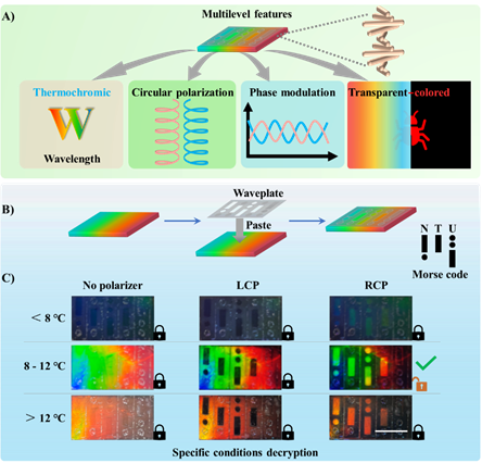 针对这一问题,西安交通大学物理学院研究人员与新加坡南洋理工大学合作,从仿生的角度,通过从甲虫独特的变色能力和偏振特性中获取灵感,开发出一种兼具透明、热致变色和圆偏振特性的胆淄相纤维素复合材料(CPCC)。通过将自组装形成的胆淄相液晶结构的羟丙基纤维素嵌入到聚(N-异丙基丙烯酰胺)(PNIPAM)网络中,获得了PNIPAM交联的胆淄相纤维素薄膜。结果发现通过调节紫外线照射时间可以改变PNIPAM的交联度,进而调控胆淄相纤维素薄膜的热致变色行为。而且由于复合薄膜中的胆淄相只能反射右旋圆偏振光,当与波片结合时,反射光的旋转方向会发生翻转,因而在有波片区域和无波片区域展现出亮度不同的结构色。此外,CPCC的透明度极高,可与环境完美融合,提供了良好的伪装效果。进一步将CPCC独特的热致变色、圆偏振和透明特性与摩尔斯编码技术相结合,可以产生多级信息加密效果,有效提高了加密信息的安全性。这一材料的获得为进一步设计和开发高安全性信息加密和防伪材料提供了新的思路和方向。