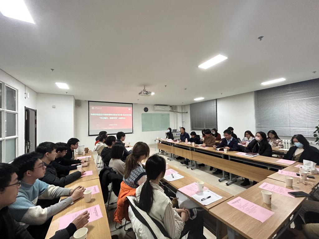 11月15日下午,物理学院在仲英楼开展本科生师生联合党支部与机关党支部结对暨“牢记嘱托,强国有我”主题党日活动。物理学院党委书记张莹、党委组织员武婧、办公室主任代旺、机关党支部书记魏小平、师生联合党支部书记刘少杰参会,机关支部全体党员、联合党支部学生党员共计20余人参加活动。会议由魏小平主持。