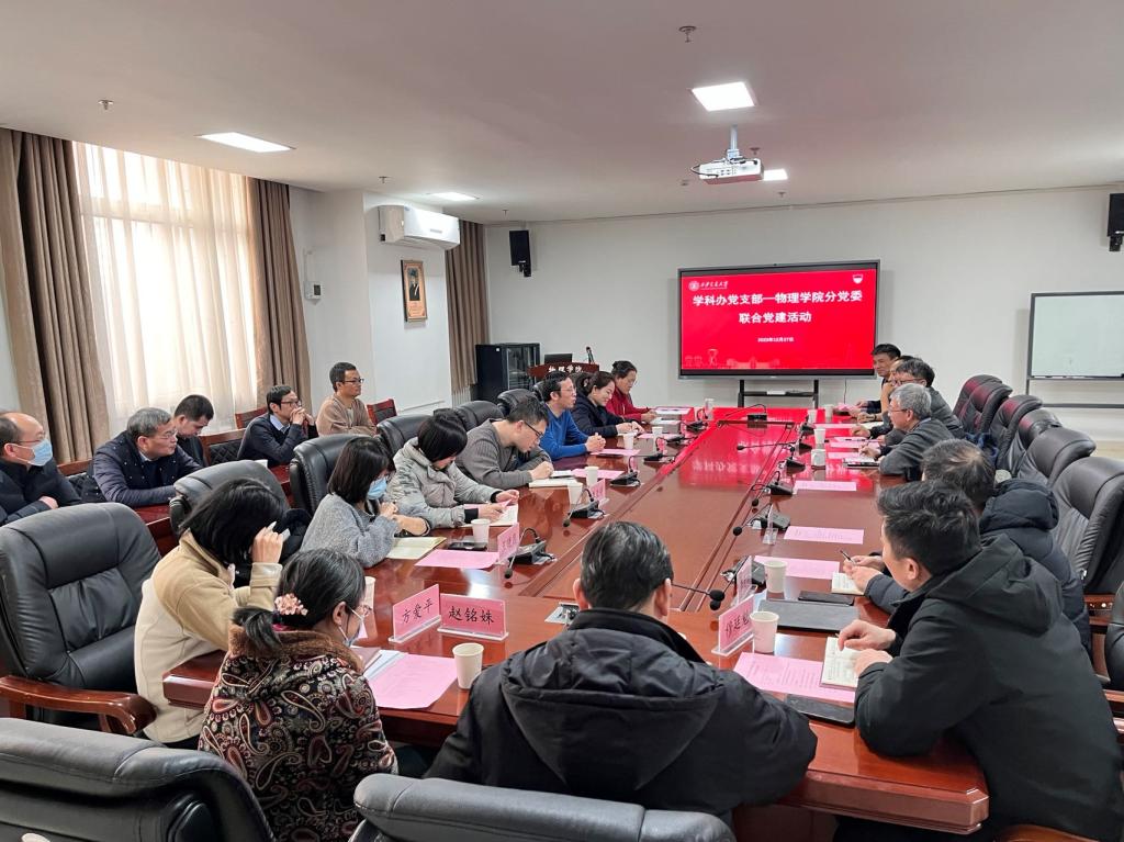 12月27日下午,学科办党支部和物理学院分党委联合开展组织生活,集体学习习近平总书记在中共中央举行纪念毛泽东同志诞辰130周年座谈会上的重要讲话精神,探讨物理学科评估、建设等工作,共同推动党建引领学科高质量发展。学科办主任陈雪峰,学科办副主任、党支部书记李英英,物理学院党委书记张莹,党委副书记、院长高宏,副院长赵永涛、杨志懋、李蓬勃,学科办全体党员及物理学院系、所班子成员,光信息党支部党员代表参会。物理学院光学所所长、学科办挂职副主任栗建兴主持会议。