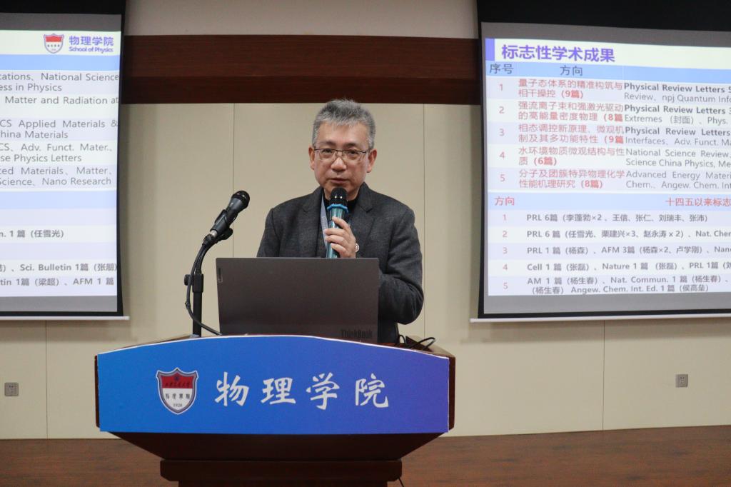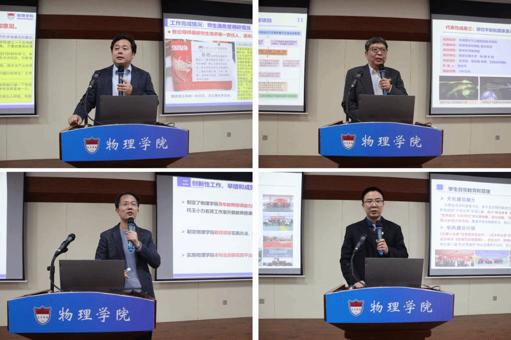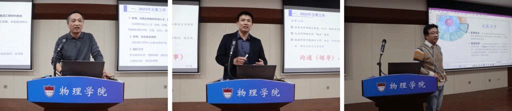 院长高宏全面总结物理学院2023年的主要工作,代表班子述职,并进行个人述职述廉。2023年物理学院在队伍建设、科学研究、人才培养和综合管理服务工作等方面都取得了喜人成绩。高宏重点汇报队伍建设、学科建设情况,在学校的大力支持下,学院在人才队伍建设方面突破明显,物理学科在教材出版、课程建设、教学成果奖、学术成果、科研到款等各方面都取得显著成效。2024年学院要明确重点发展方向,明确人才培养、科学研究等工作目标,要瞄准国家重大需求不断推进内涵式高质量发展。