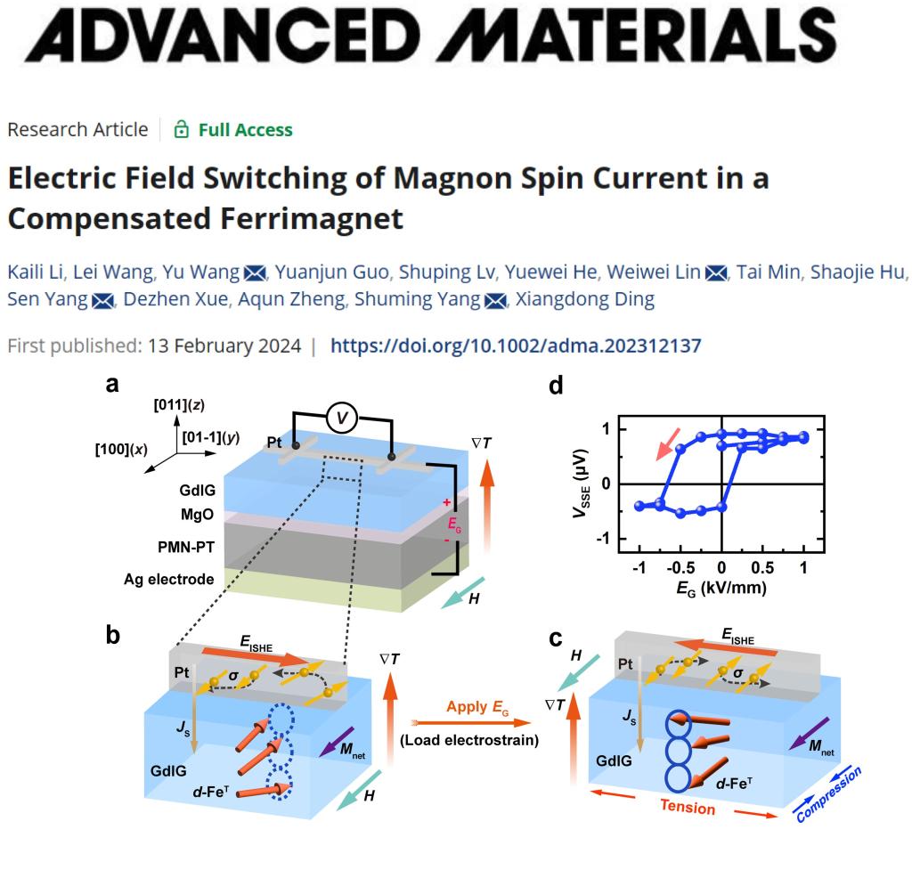 该研究工作以“Electric Field Switching of Magnon Spin Current in a Compensated Ferrimagnet”为题目发表在材料科学领域顶级期刊《先进材料》(Advanced Materials)上。该论文第一作者为西安交通大学博士生李凯丽和东南大学副教授王蕾,通讯作者为西安交通大学王宇教授、杨森教授、杨树明教授和东南大学林维维教授,西安交通大学物理学院为本论文的第一单位。该研究获到了国家自然科学基金、国家重点研发计划、陕西省重点研发计划等项目的支持。