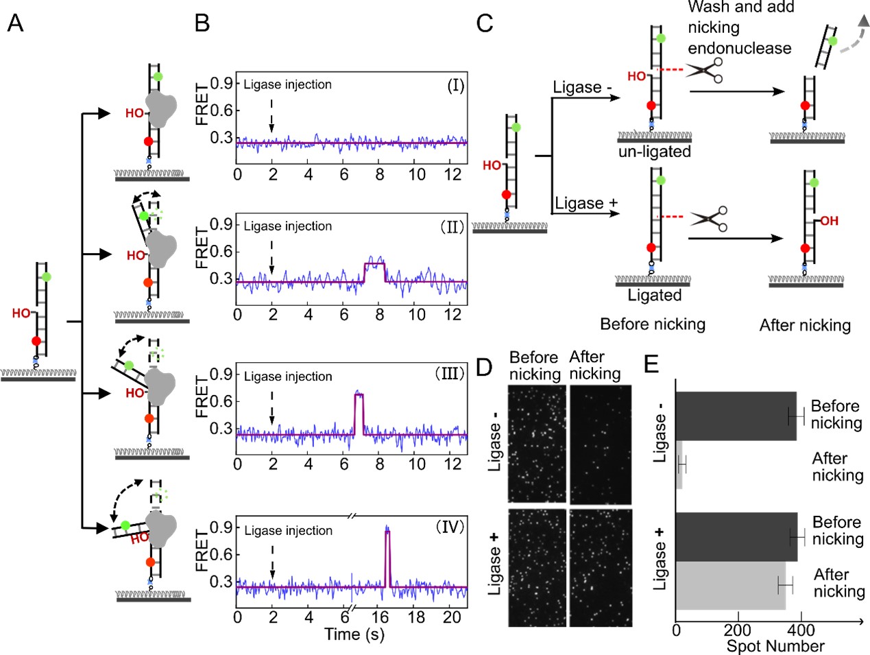 研究团队以噬菌体T4 DNA连接酶为研究对象进行了深入探索。源自T4噬菌体的DNA连接酶(以下简称T4连接酶)的分子量约为55 kDa,是第一个被发现的三磷酸腺苷(ATP)依赖型连接酶,其DNA复制、重组和修复机制已得到相对广泛的研究,但是对具有不同构象DNA底物的识别和连接反应途径仍然不清楚。为了全面了解该酶的机制,必须对其整体构象的时空动力学行为进行精密观测。包括X射线晶体学和电子显微镜可用于确定多种生物大分子的结构,然而实时观察生物过程时间尺度上的构象变化和化学反应中间过程需要单分子荧光共振能量转移等具有时间分辨率能力的技术支撑。通过将单分子技术与结构确定方法相结合,与生命过程密切相关的动态过程才可以准确呈现。
