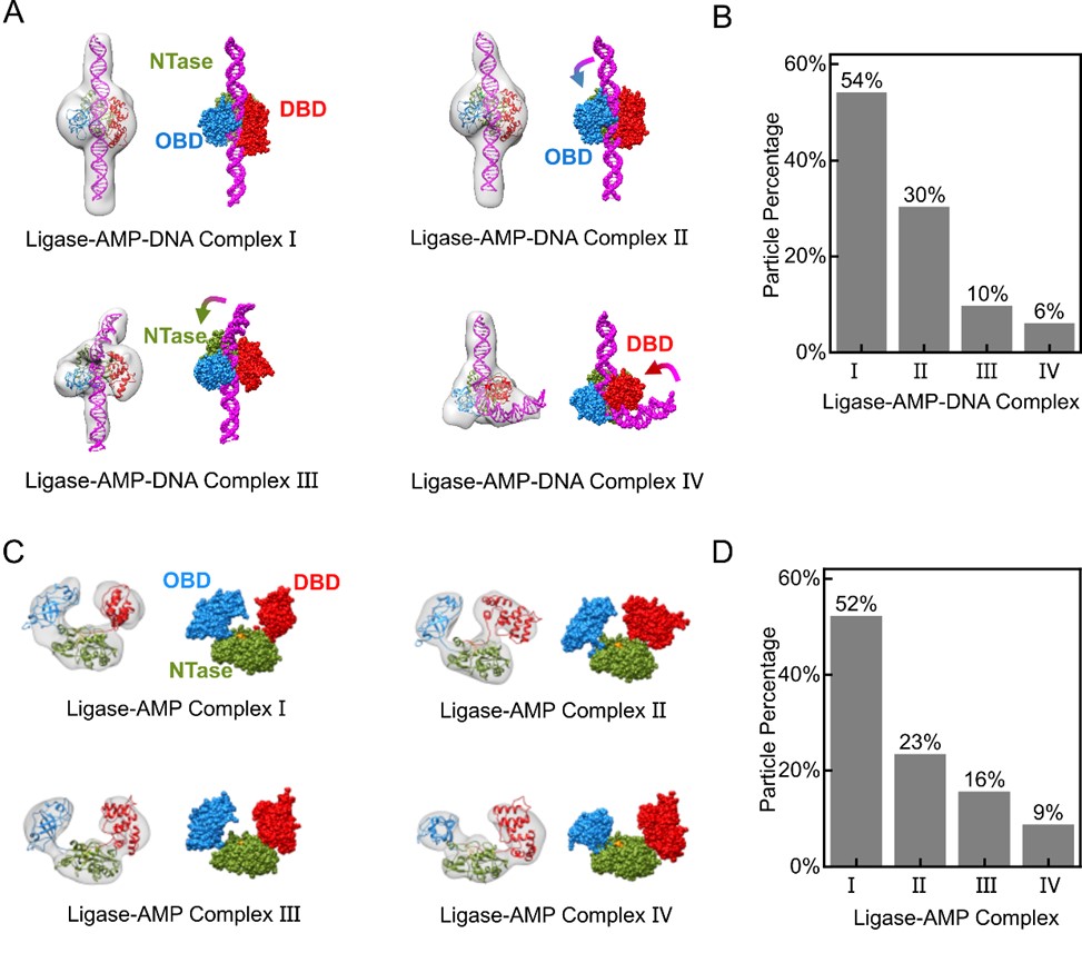 由电子显微镜重构得到的连接酶复合物结构,呈现出明显的四种稳定构象
