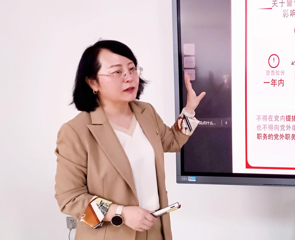 杜晓燕以“纪律是管党治党的戒尺——以学习《条例》为契机,全面加强党的纪律建设”为题,围绕党纪学习教育的主题,从重点内容与相关案例解读、带头学习贯彻《条例》,把铁的纪律转化为日常行为规范等方面深入解读新修订的《中国共产党纪律处分条例》的主要内容和思想内涵。杜老师结合相关典型案例,重点阐述了《条例》总则、分则和附则中的重点内容,着重介绍新修订条款的基本内涵。她表示,要把铁的纪律转化为日常行为规范准则,带头做“两个维护”的践行者,做清正廉洁的“老实人”,做学习贯彻《条例》的领头雁。