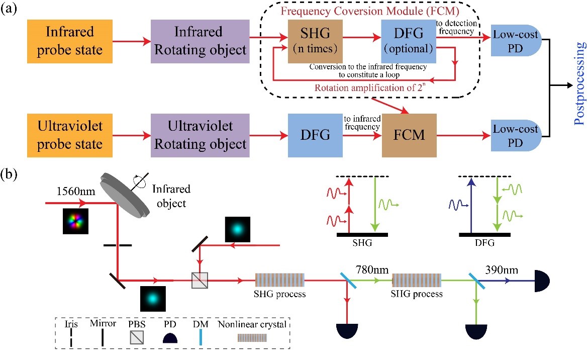 针对这一关键科学问题,张沛教授团队将旋转多普勒效应与谐波产生过程相结合,提出了一种全新的旋转测量方案(如图所示),不仅能够实现灵活的检测波长转换,还可以显著提升测量分辨率,并实时显示检测结果。通过倍频过程累积光子相位,使用倍频和差频组成的循环结构可以实现任意波长的转换。此外,该方案可与前端增大轨道角动量的传统技术相结合,形成前后端联动的一体化测量设备。