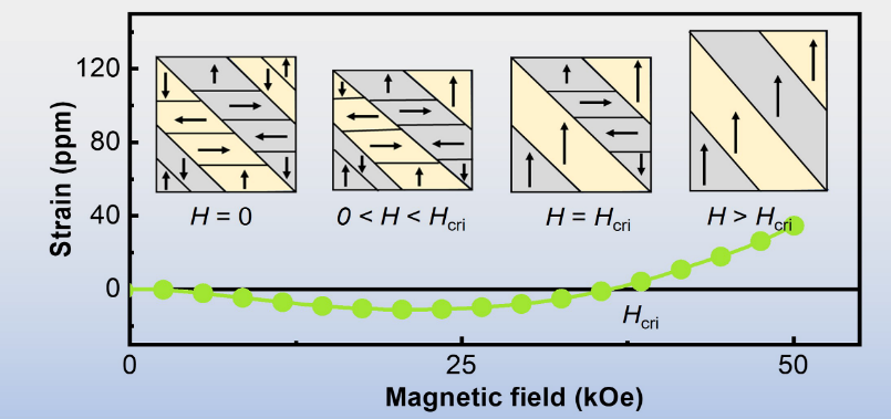 该研究通过构建具有不同磁响应结构共存的准同型相界,实现对Ni50Mn34Sb16−xGax合金磁致伸缩性能的灵活调控。发现在两相共存的准同型相界区域,存在正负应变交替共存的“W”型磁致伸缩效应。而该研究不仅揭示了磁性与晶体结构耦合作用的微观机制,还提出了一种基于准同型相界调控磁致伸缩性能的新策略。通过调控合金成分和相界结构,能够实现对磁致伸缩应变的方向性与幅值的精准控制,为未来设计具有多功能响应特性的智能材料提供了理论依据和实践路径。这一成果为磁致伸缩材料的设计与调控提供了新的思路,也为拓展其在传感、驱动、能量转换等领域的应用奠定了坚实基础。