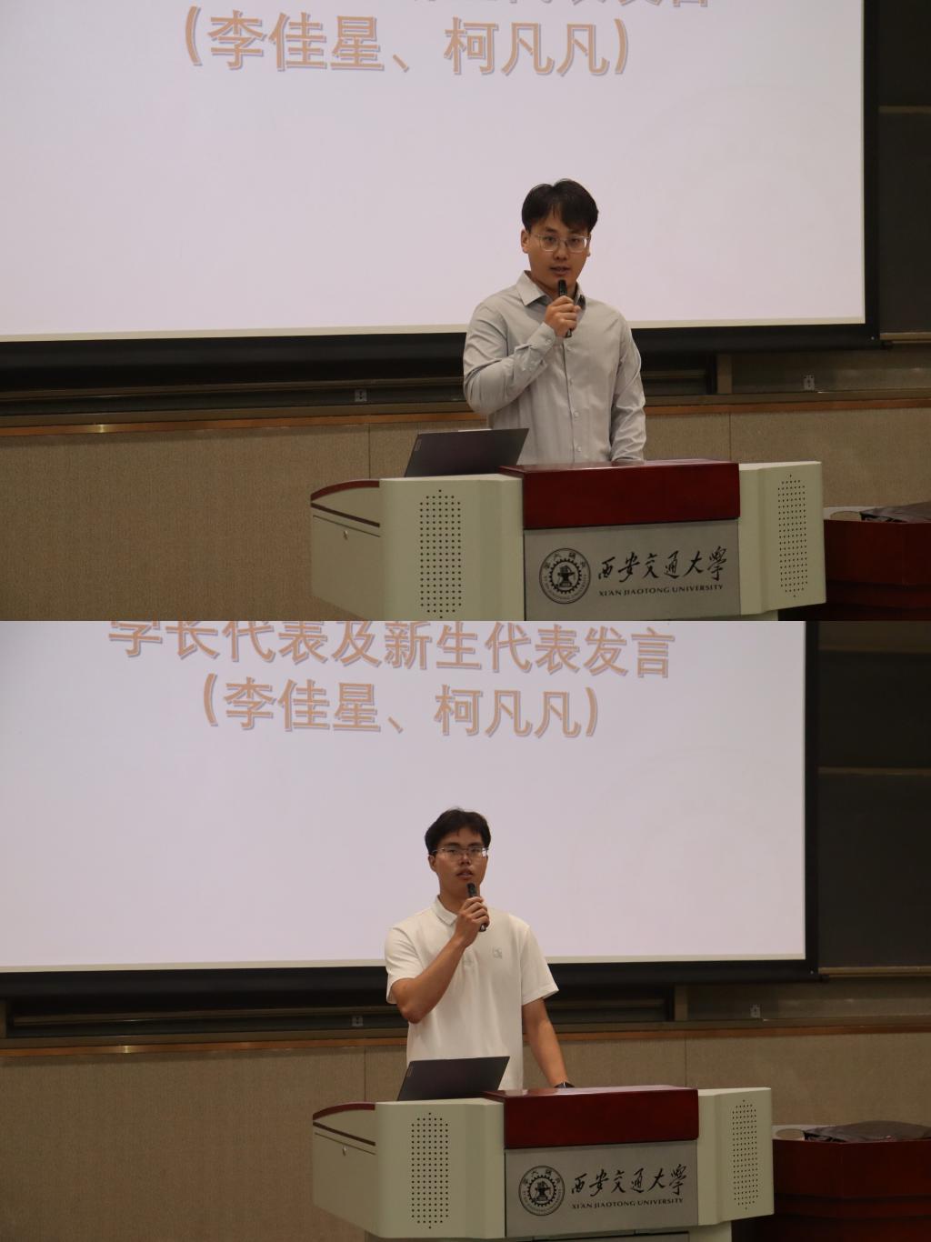 学长代表李佳星同学结合自身科研与实践经历,从研究生成长的角度为新生们提出了切实可行的建议。他建议学弟学妹们要尽早明确研究方向,注重团队合作,积极参与各类学术和文体活动,保持科研与生活的平衡。新生代表柯凡凡同学在发言中表示,将心怀感恩、脚踏实地,勇于面对未来的挑战,传承好西迁精神,努力成长为有责任感、有能力的时代新人。