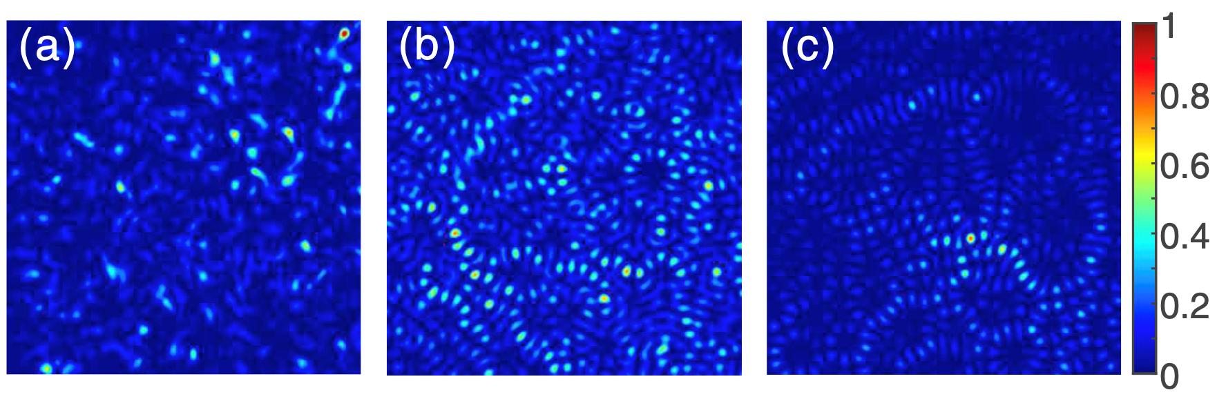 图1 (a) 非瑞利统计散斑;(b)无衍射散斑;(c)无衍射非瑞利散斑。