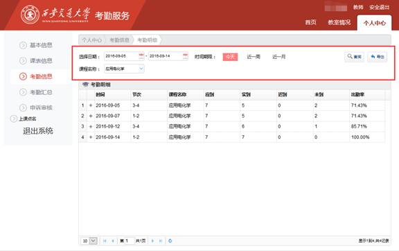 按课程名称查询所教课程一个时间段内每个学生到课情况,查询数据支持以excel表格形式导出。