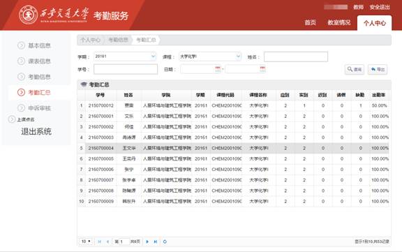 可查询一个时间段内每门课的到课信息,并可查看每个学生本节课刷卡记录,查询数据支持以excel表格形式导出。