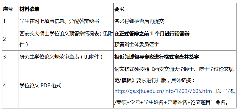 3.需提交材料及相关要求:学位论文PDF格式,论文格式须按照《西安交通大学硕士、博士学位论文规范/模板》要求进行排版,以“学硕/专硕+学号+学生姓名+导师姓名+论文题目”命名。由答辩秘书在5月15日之前通过邮件发至xiaoaiguo@xjtu.edu.cn,由学院统一进行查重。