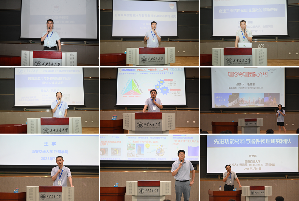 随后,物理学院九大研究团队依次进行主题宣讲,量子光学与量子信息团队李蓬勃教授、生物物理与凝聚态物理团队王喆教授、成像光学团队雷铭教授、光资源应用与多物理场技术团队沈礼华教授、激光与粒子束科学技术团队赵永涛教授、理论物理团队毛施君教授、智能材料与传感团队王宇教授、空间光学与天文物理团队穆廷魁教授以及先进功能材料与器件物理团队杨生春教授从研究背景、核心项目、团队特色及未来发展规划等方面作了全面介绍,并与营员开展现场问答,增进了师生双向了解。