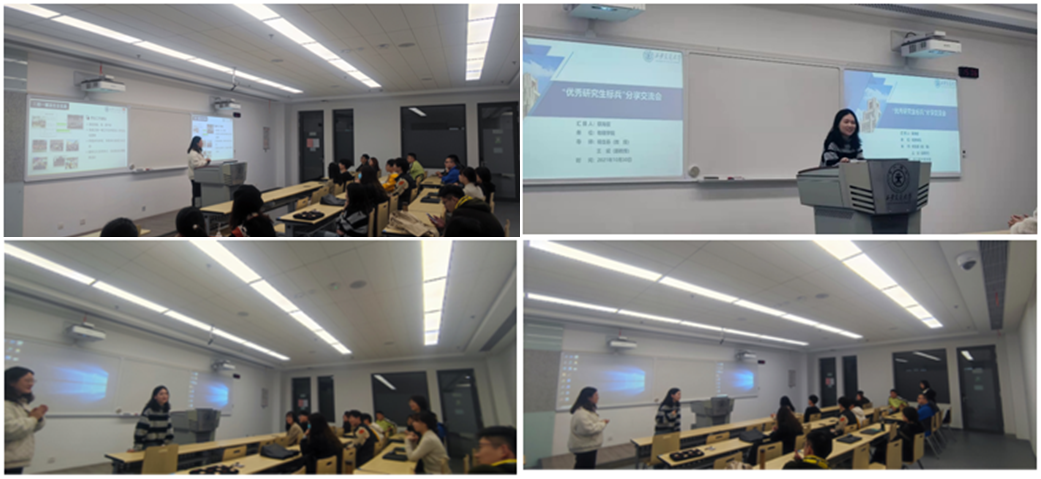 “梦在远方,路在脚下”,硕士研究生裴格锐结合自身科研经历建议新同学要尽早确定研究方向并积极主动和导师多沟通。她告诉同学们科研之路不是一帆风顺,要学会调整自己心态,对未来有明确的规划,才能勇往直前、追求卓越。裴格锐给同学们分享了兼职辅导员和志愿活动的经历,鼓励大家要有奉献和服务意识,要发挥学生党员的先进性和引领性。