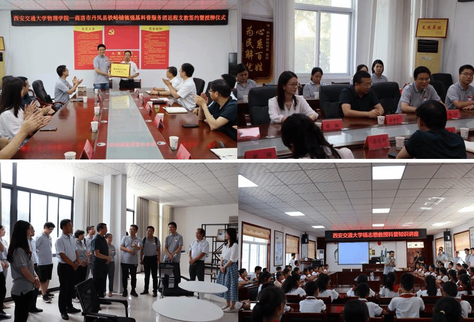 2022623日,物理学院机关党支部、硕2021级党支部联合陕西省人力资源社会保障厅前往丹凤县武关镇、铁峪铺镇开展强基科普宣讲团活动,共谋校地联合发展,助力乡村教育振兴。陕西省人力资源社会保障厅副处长张争京、物理学院党委副书记张沛、副院长杨志懋带队参加此次活动。20227月下旬,硕2021级党支部联合物理学院研究生会面向丹凤县乡镇小学学生举办强基科普宣讲团线上科普活动。通过招募学生志愿者为100余名乡镇小学生讲解西安交大校史、科学家故事、科学实验演示等,勉励同学们努力学习,报效祖国。